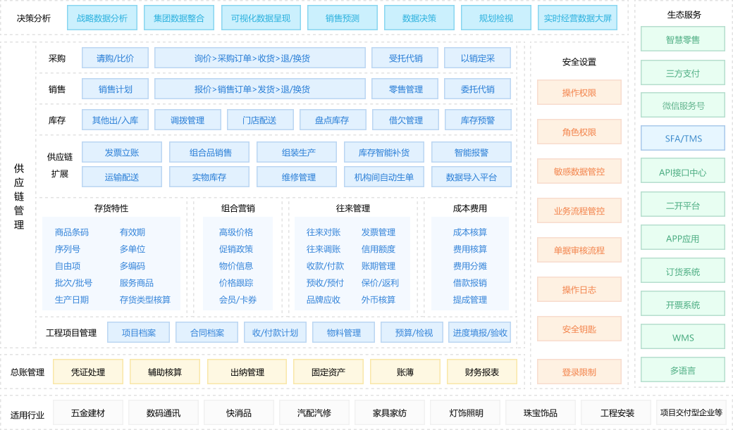 实现同一平台多种业务扩展;多级权限及角色管理,专业化分工、工作流管理;自定义与单据报表多样化。